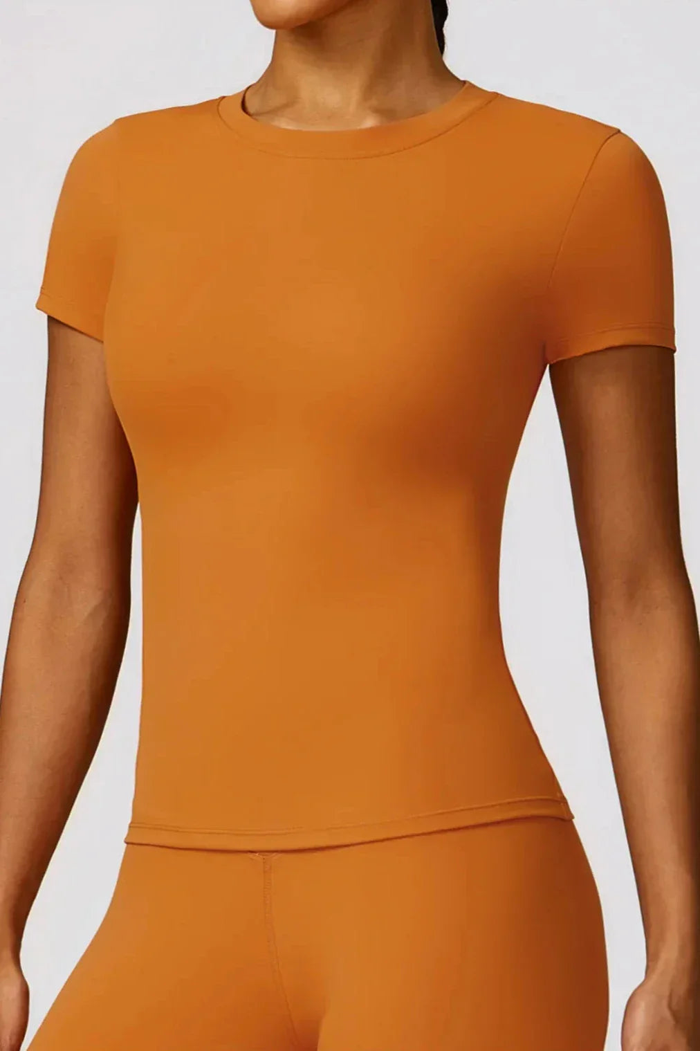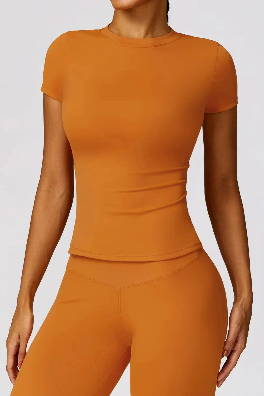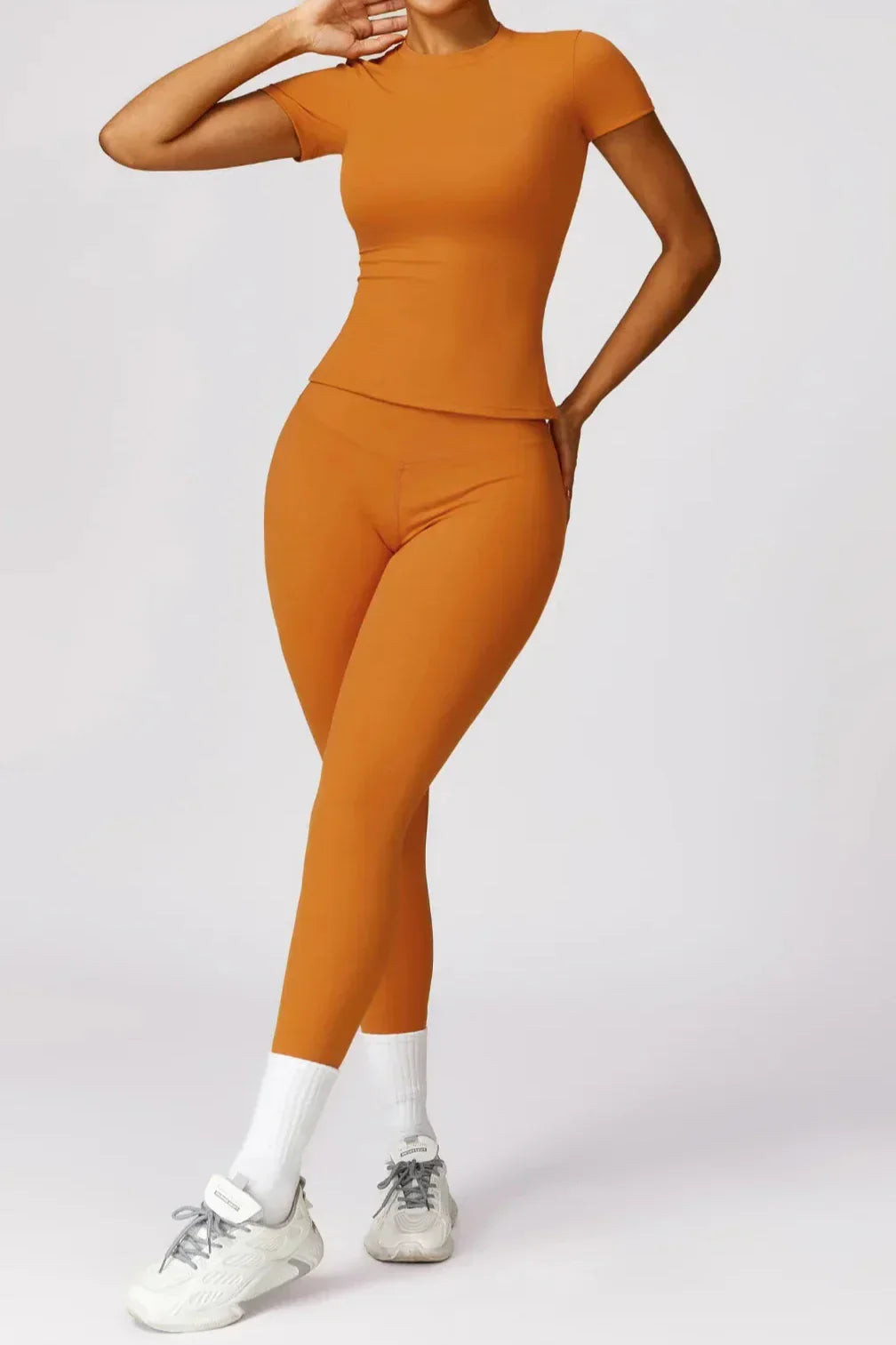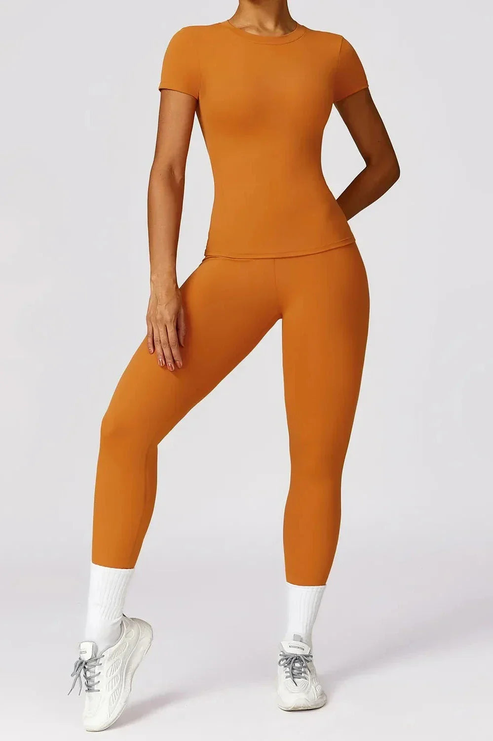 Dame Träningsset - Sömlös T-shirt och Höga tights - Andningsbar och Elastisk. Upplev optimal komfort och rörelsefrihet med detta sömlösa träningsset. Setet består av en åtsittande T-shirt och höga tights, designade för att ge stöd och andningsförmåga under alla träningspass. Perfekt för yoga, pilates eller styrketräning.
